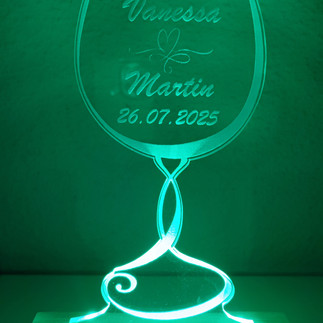 Kürzlich durften wir für ein ganz besonderes Paar – Vanessa & Martin – einen individuell gravierten LED-Ständer fertigen. In filigraner Weinglas-Form, mit liebevoll geschwungenen Linien, eingravierten Namen und ihrem Hochzeitsdatum: 26.07.2025.